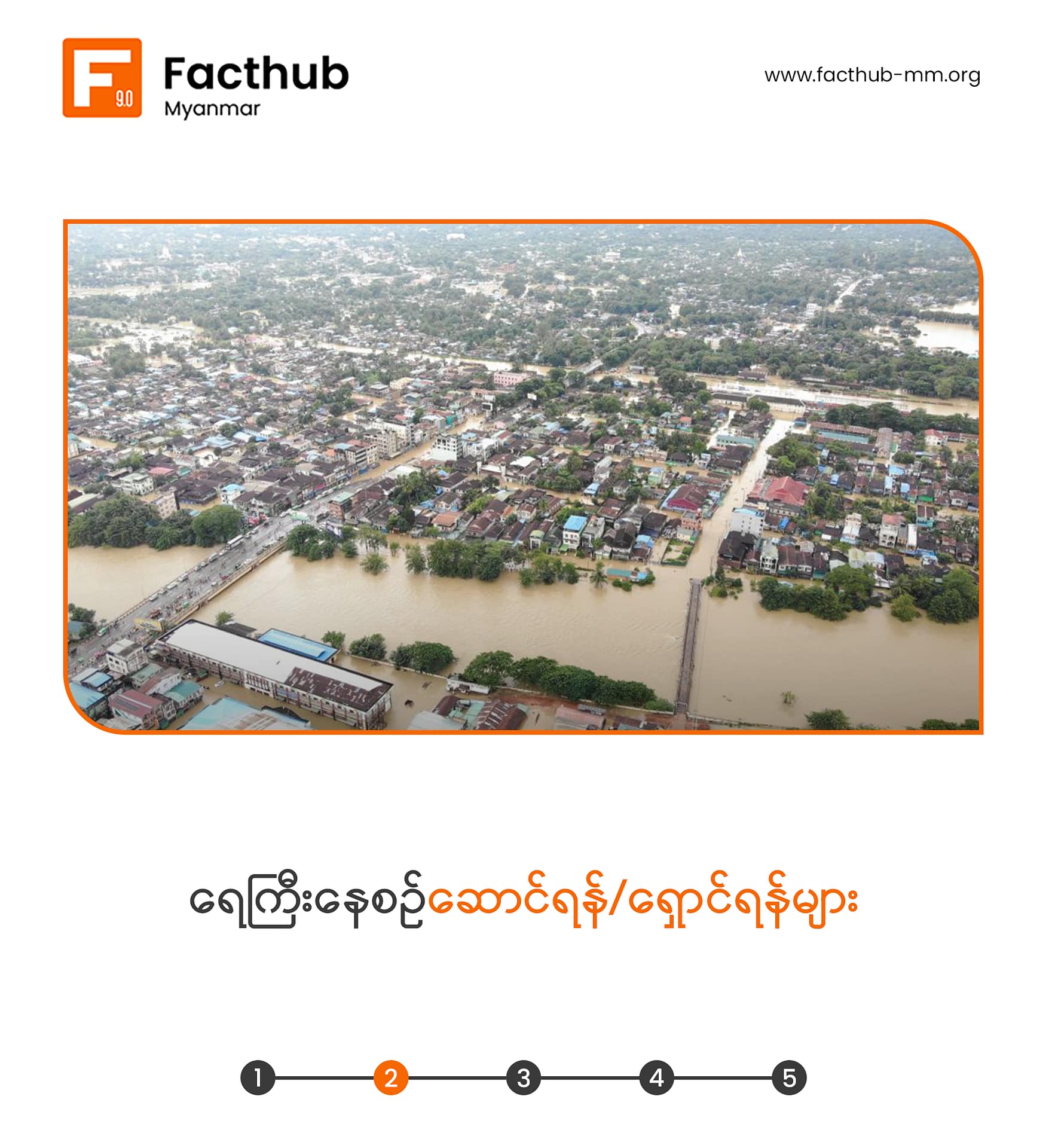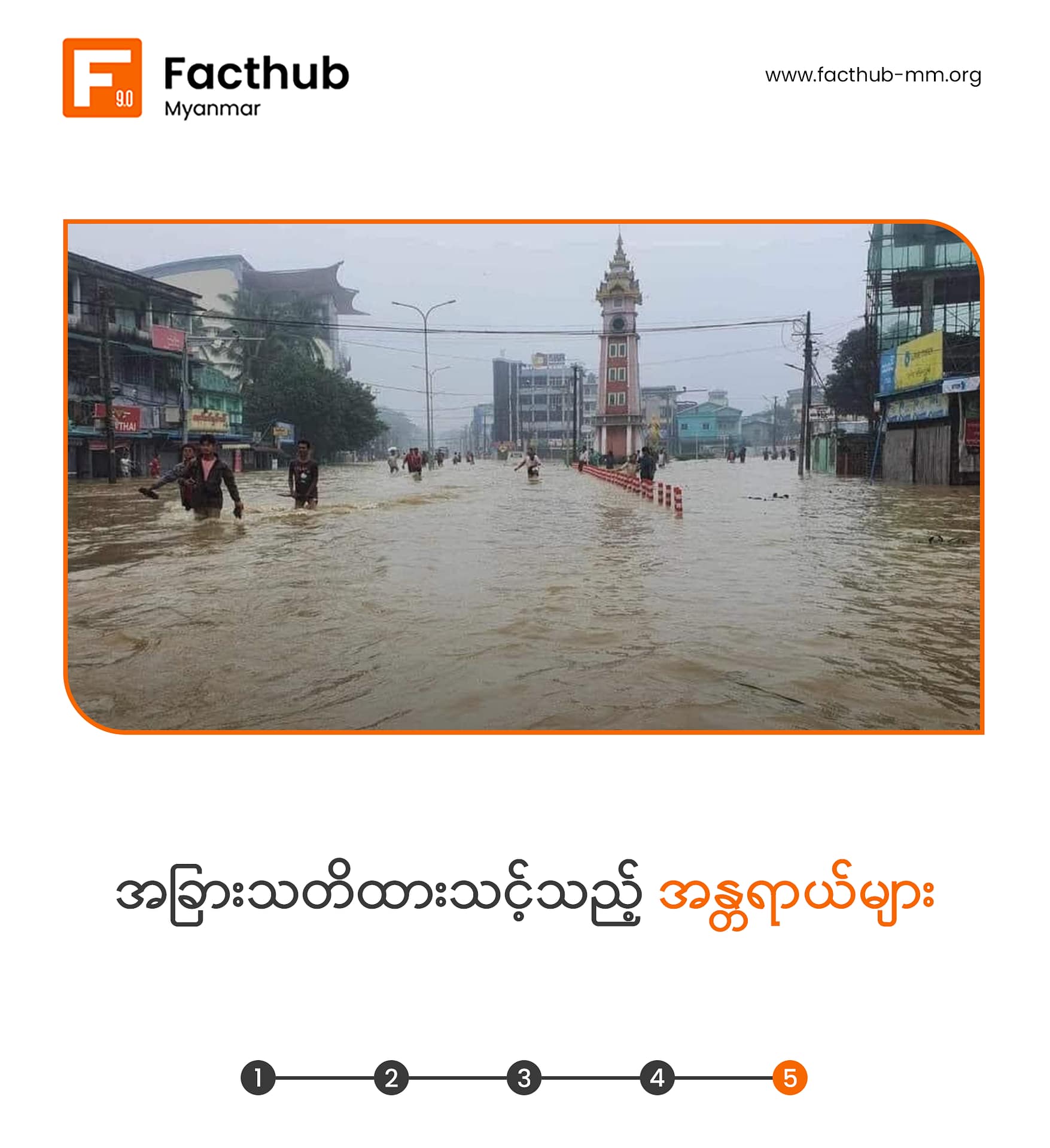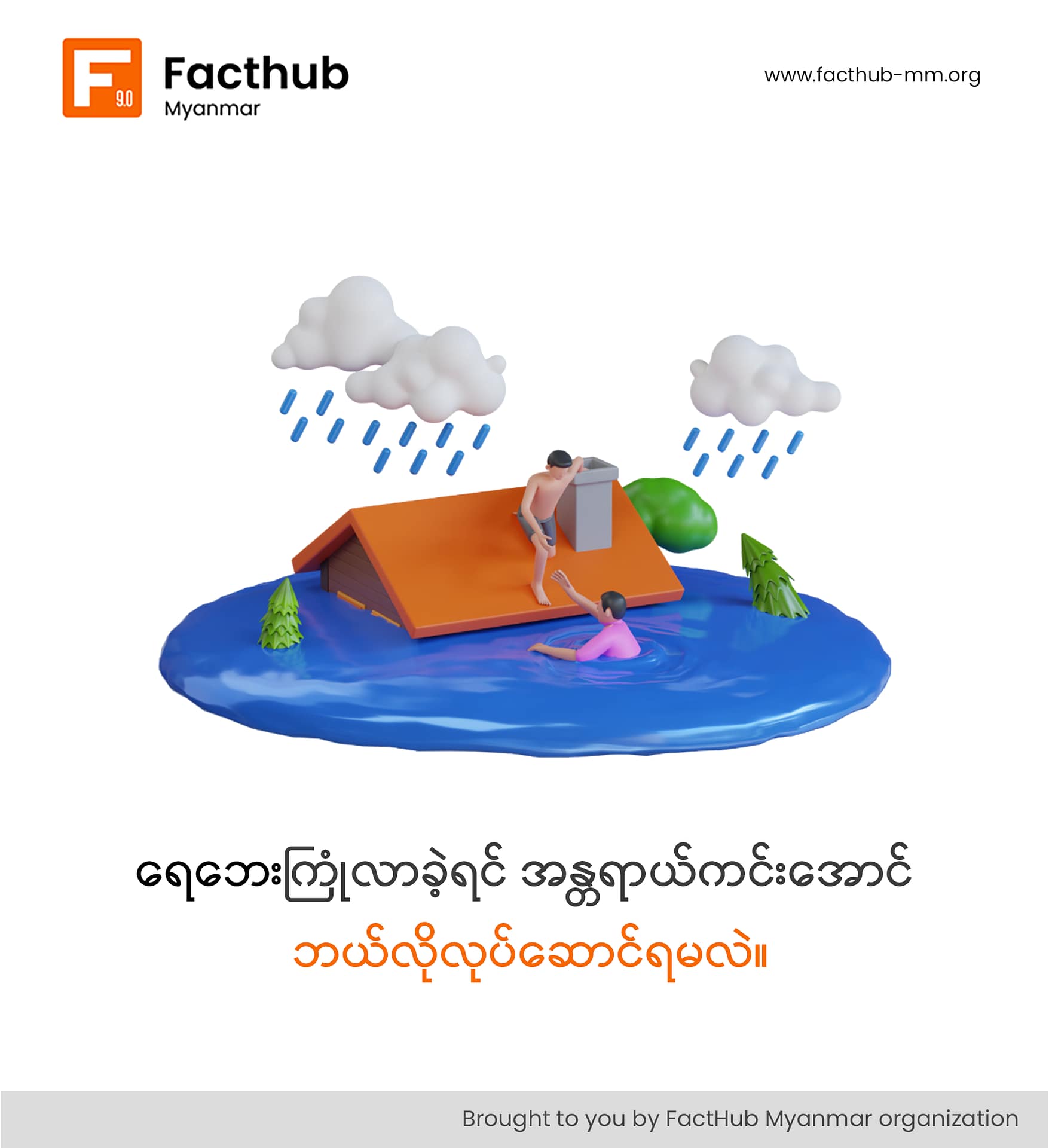 သဘာ၀ဘေးအန္တရာယ်တွေကဟာရှောင်လွှဲလို့မရတဲ့အတွက် ကျရောက်လာခဲ့ရင် အရံသင့်ရှိနေဖို့ ကြိုတင်ပြင်ဆင်ထားသင့်ပါတယ်။ ဒီရက်ပိုင်း မိုးအဆက်မပြတ်ရွာသွန်းနေတာကြောင့် ဒေသတချို့မှာ ရေကြီးရေလျှံမှုတွေ ဖြစ်ပွားနေပါတယ်။ ရေကြီးနေစဥ်နဲ့ ရေကြီးပြီးတဲ့အခါ ဘေးကင်းအောင် ဘယ်လိုနေထိုင်သင့်သလဲဆိုတာတွေကို Fact Hub က မျှဝေပေးချင်ပါတယ်။