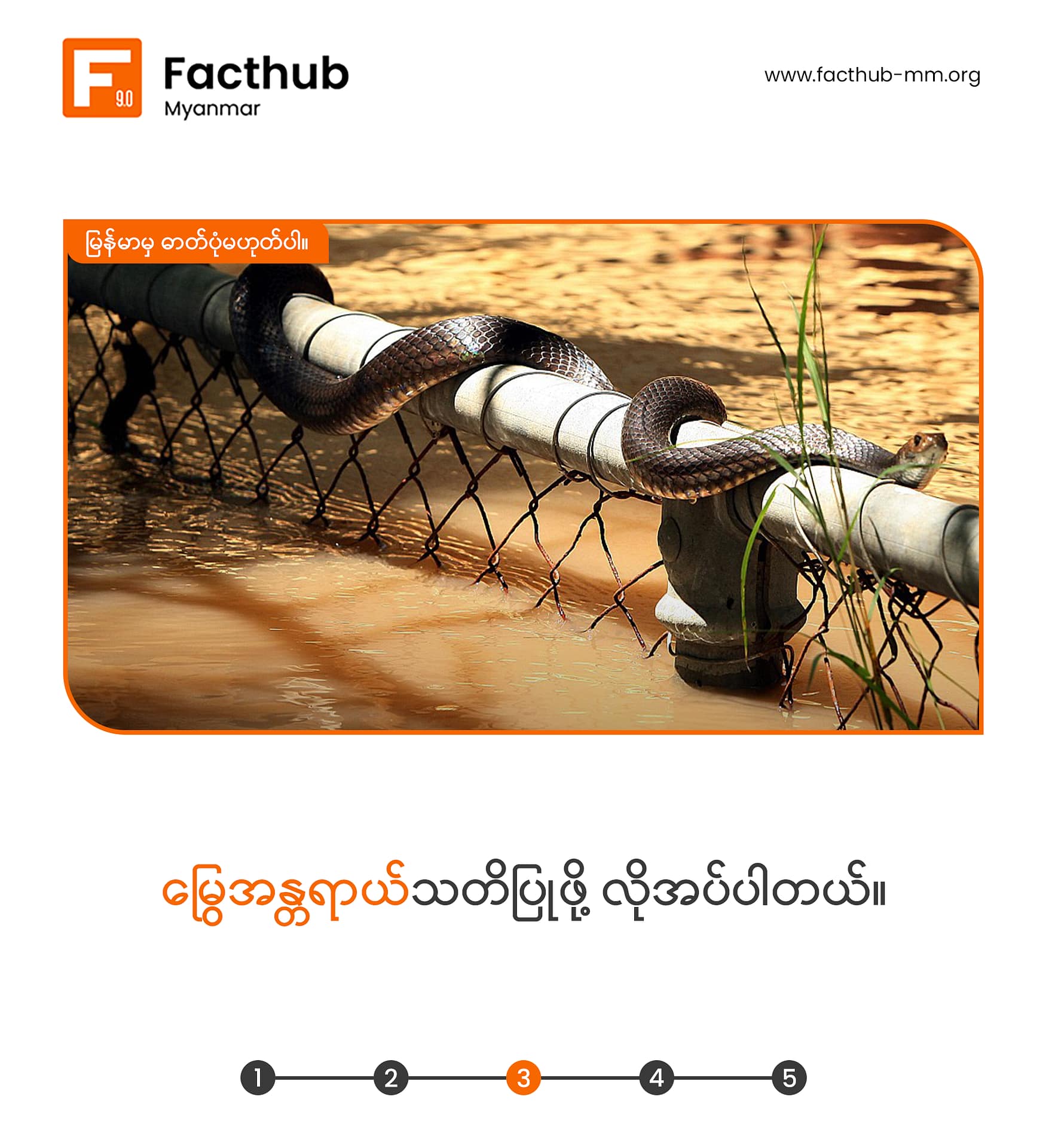 ရေကြီးချိန်ဟာ ပုံမှန်အားဖြင့် ရာသီအကူးအပြောင်း(သို့) မိုးရာသီဖြစ်တဲ့အတွက် မြွေသားပေါက်ရာသီဖြစ်တဲ့အလျောက် မြွေတွေကိုပိုမြင်တွေ့ရတတ်ပြီး မြွေအန္တရာယ်ကို အထူးဂရုစိုက်ဖို့ လိုပါတယ်။ ရေနဲ့အတူမျောပါလာတဲ့ ပစ္စည်းတွေကိုထိ/ကိုင်ခြင်းမျိုး၊ မြွေခိုအောင်းနေနိုင်တဲ့ နေရာတွေကို သွားခြင်းမျိုးတွေ မပြုလုပ်သင့်ပါဘူး။ မြွေတွေ့ရှိပါကလည်း သက်ဆိုင်ရာ အဖွဲ့အစည်းတွေကို အကြောင်းကြားပြီး သူတို့အကူအညီနဲ့ ဖမ်းဆီးခြင်းမျိုးသာ ပြုလုပ်သင့်ပါတယ်။ အမျိုးအစား သေချာမသိတဲ့မြွေတွေကို လုံးဝမကိုင်သင့်ပါဘူး။ အကယ်၍ မြွေကိုက်ခံရလျှင် ပထမဆုံးအနေနဲ့ စိတ်ကိုတည်ငြိမ်စွာထားပါ။ အကို-က်ခံထားရတဲ့ နေရာကို ဆပ်ပြာ၊ ရေကို အသုံးပြုကာ သန့်ရှင်းအောင်ဆေးပေးပါ။ မြွေကိုက်ခံရတဲ့ဒဏ်ရာကို ပါးစပ်နဲ့စုပ်တာ၊ အဝတ်စ ပတ်တီးတွေနဲ့ တင်းတင်းကျပ်ကျပ်စီးတာတွေကနေ ရှောင်ပါ။ ဒဏ်ရာပေါ်ကို ရေခဲကပ်ခြင်း၊ ရေနွေးအိတ်ကပ်ခြင်းဆေးလူးခြင်းတွေ မလုပ်ပါနဲ့။ ခြေလက်များ မလှုပ်ရှားမိစေဖို့ အ၀တ်စ တုတ်များဖြင့် ချည်နှောင်ထိန်းထားပါ။ မြွေဆိပ်ကို မြွေဆိပ်ဖြေဆေးတစ်မျိုးတည်းနဲ့သာ ကုသနိုင်တာကြောင့် လူနာကို ဆေးရုံကိုသာ အတတ်နိုင်ဆုံး အမြန်ပို့ဆောင်ပါ။