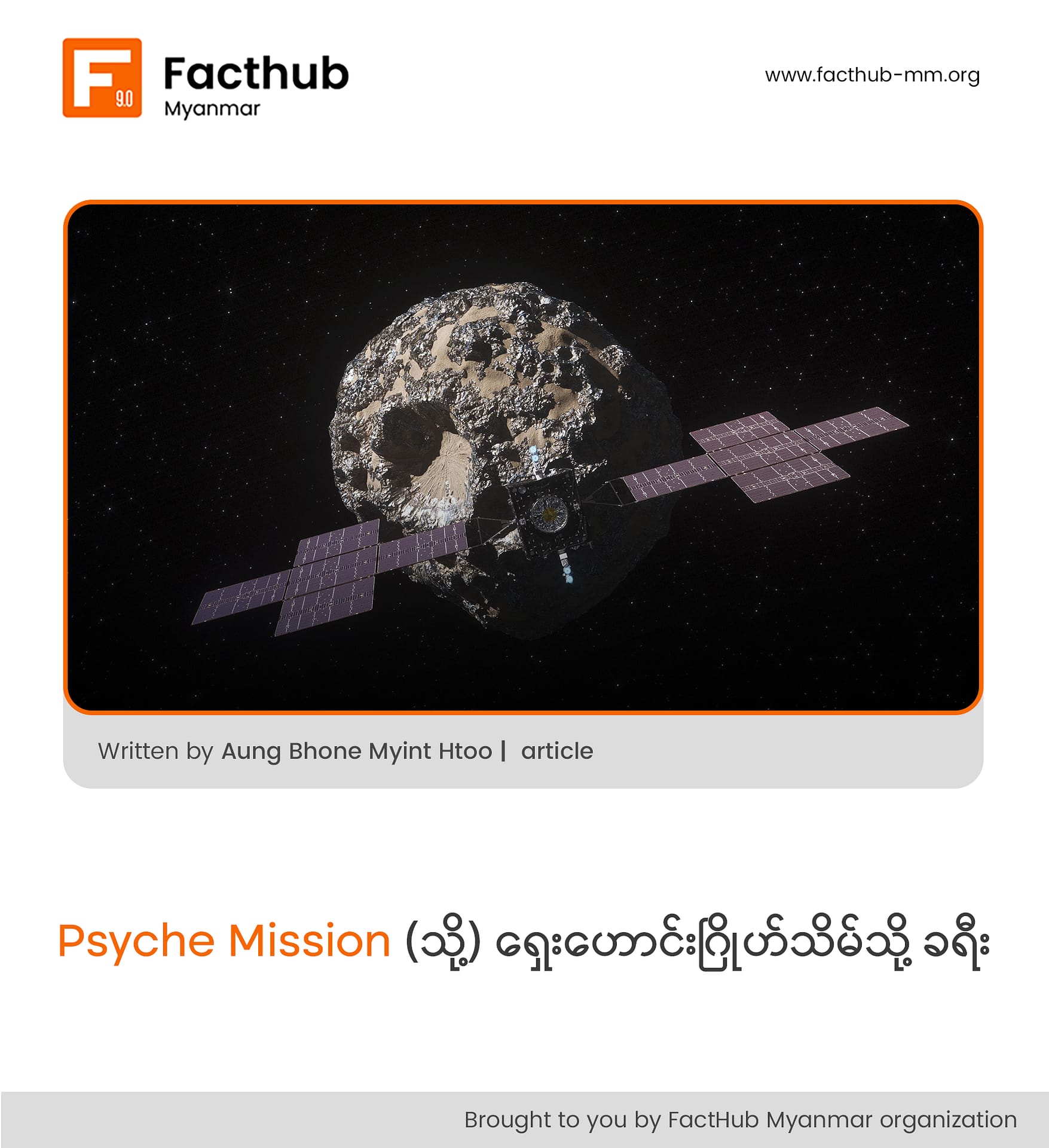 Psyche ဆိုတာက အံစာတုံးကား အရွယ်ရှိပြီး တောင်ပံနဲ့တူတဲ့ ဆိုလာပြားတွေ တပ်ဆင်ထားတဲ့ ဂြိုဟ်တုတစ်လုံးပါ။ Psyche ကို အောက်တိုဘာလ ၁၂ ရက်နေ့ မြန်မာစံတော်ချိန် ည ၈ နာရီ ၄၆ မိနစ်မှာ နာဆာရဲ့ ကန်နေဲဒီအာကာသစင်တာက SpaceX Falcon Heavy Rocket နဲ့ လွှတ်တင်ခဲ့ပါတယ်။ ဂြိုဟ်တုရဲ့ ပန်းတိုင်ကတော့ Psyche လို့ပဲခေါ်တဲ့ ဂြိုဟ်သိမ်တစ်ခုဖြစ်ပြီး ခြောက်နှစ်အကြာမှာ ရောက်မယ်လို့ ခန့်မှန်းထားကြပါတယ်။ ဂြိုဟ်တုဟာ ၂၀၂၉ ခုနှစ်မှာ အင်္ဂါဂြိုဟ်နားကို ချဉ်းကပ်မှာဖြစ်ပြီး အဲ့ကတစ်ဆင့် အင်္ဂါဂြိုဟ်ရဲ့ ဒြပ်ဆွဲအားအကူညီနဲ့ လမ်းလွှဲတစ်ခု ဖန်တီးပြီး ဂြိုဟ်သိမ်ဆီ ခရီးဆက်မှာပါ။ ဂြိုဟ်သိမ်ဆီ ရောက်ရင်တော့ နောက် ၂၆ လစာ ဂြိုဟ်သိမ်ကို လှည့်ပတ်ပြီး လေ့လာမှုတွေ ပြုလုပ်မှာပါ။ ပြုလုပ်မဲ့ လေ့လာချက်တွေကတော့ ကျောက်သားနမူနာကောက်ယူတာ၊ မျက်နှာပြင် ဖွဲ့စည်းပုံကိုဆန်းစစ်တာ၊ ဒြပ်ဆွဲအား ဖွဲ့စည်းပုံကို ဆန်းစစ်တာနဲ့ သံလိုက်စက်ကွင်းရှိရင် တိုင်းတာတာတွေ ပြုလုပ်မှာပဲဖြစ်ပါတယ်။ ဂြိုဟ်တုနဲ့ အတူပါသွားမဲ့ ကိရိယာတွေက ရောင်စဉ်စုံ ပုံရိပ်ဖမ်းစက်၊ ဂမ်မာရောင်ခြည်နဲ့ နျူထရွန်ရောင်စဉ် တိုင်းစက်၊ သံလိုက်စက်ကွင်းတိုင်း ကိရိယာနဲ့ ဒြပ်ဆွဲအားတိုင်းတာဖို့ ရေဒီယိုကိရိယာတို့ပဲ ဖြစ်ပါတယ်။