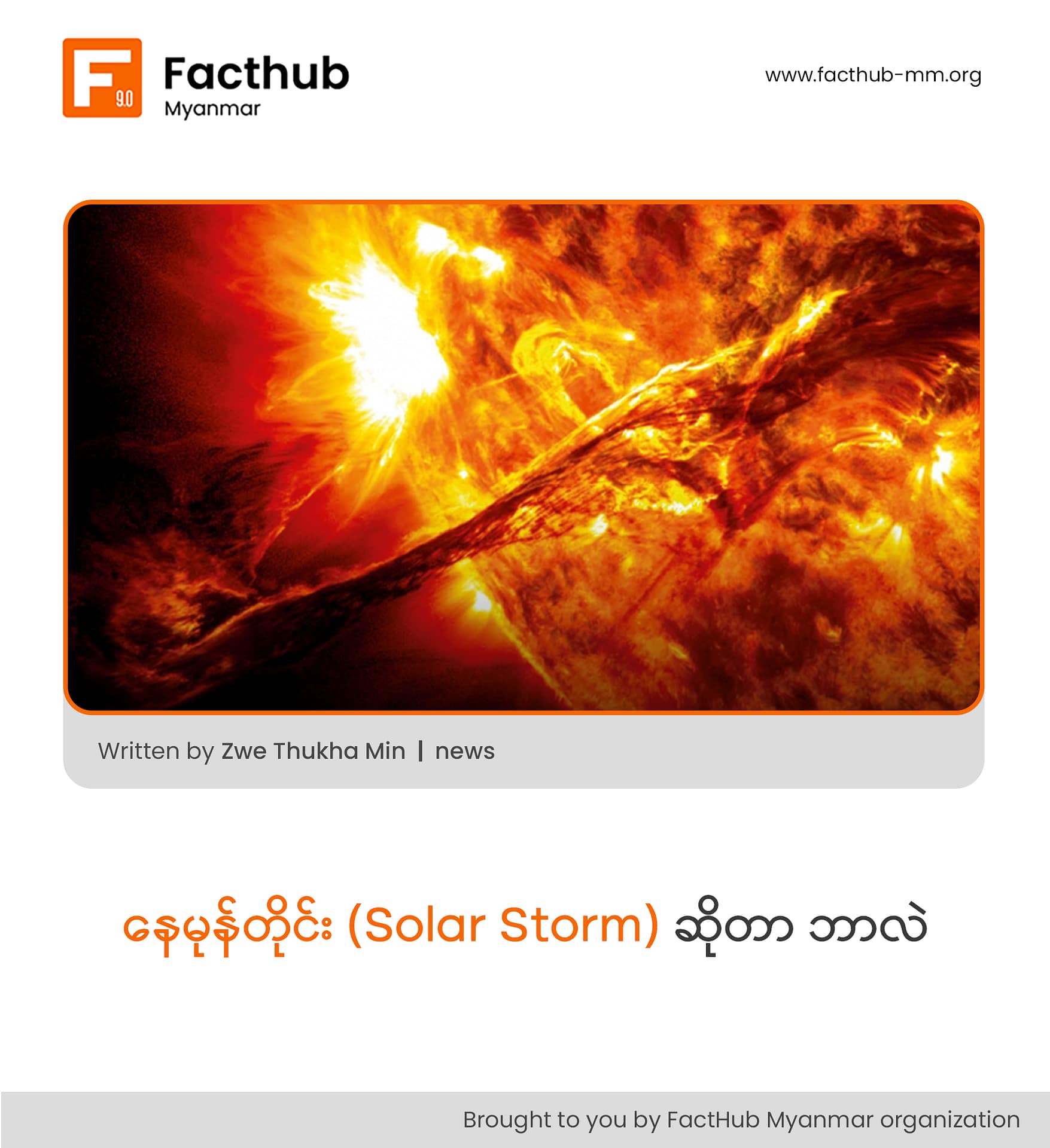 ဒီသတင်းအပေါ် အခြေခံလို့ နေမုန်တိုင်းဆိုတာ ဘာလဲ .. နေမီးတောက်တွေ Coronal Mass Ejection (CME) လို့ ခေါ်တဲ့ ဖြစ်စဉ်တွေကရော ဘာလဲ၊ ဘာလို့ အဲ့ဒါတွေ ဖြစ်ရတာလဲ၊ ကမ္ဘာကို ရိုက်ခတ်မှာလား၊ ရိုက်ခတ်ရင်ရော ဘာဆက်ဖြစ်နိုင်လဲ .. ဒီကိစ္စလေးတွေ ဆွေးနွေးကြည့်ချင်ပါတယ်။
