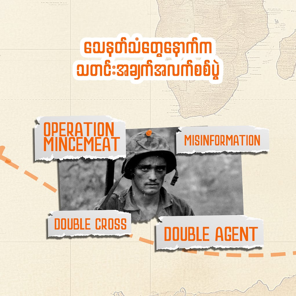 နောက်ထပ် ဗြိတိသျှတွေ အချက်အလက်မှား ဖြန့်ပြီး ဆင်နွှဲခဲ့တဲ့ စစ်ဆင်ရေးကတော့ Operation Mincemeat ပါ။ ၁၉၄၃ ခုနှစ်၊ ဧပြီလ ၃၀ ရက်နေ့မှာ စပိန်ကမ်းရိုးတန်းကို အလောင်းတစ်လောင်း မျောလာခဲ့ပါတယ်။ အလောင်းမှာပါတဲ့ သက်သေတွေအရ သူဟာ တော်ဝင်ရေတပ်ရဲ့ အကြီးအကဲ ဝီလီယမ်မာတင် (William Martin) ဖြစ်ပြီး သူနဲ့အတူ လျှို့ဝှက်ဖိုင်တွဲတစ်ခု ပါလာခဲ့ပါတယ်။ ဖိုင်ထဲမှာတော့ မဟာမိတ်တွေရဲ့ နောက်ထပ်တိုက်ခိုက်မဲ့ ပစ်မှတ်ဟာ ဂရိနဲ့ ဆာဒီနီးယားဒေသ ဖြစ်တယ်ဆိုတာပါပဲ။ ဒါကို သိသိချင်း စပိန်အာဏာပိုင်တွေထဲက ဂျာမနီဘက်ယိမ်းသူတွေဟာ ဂျာမန်ထောက်လှမ်းရေးကို သတင်းပို့ခဲ့တာကြောင့် ဂျာမန်တွေဟာ ဂရိ၊ ဘောတစ်ဒေသနဲ့ ဆာဒီနီးယားဒေသ တွေမှာ နေရာယူ လုံခြုံရေးတိုးမြင့်ခဲ့ပါတယ်။