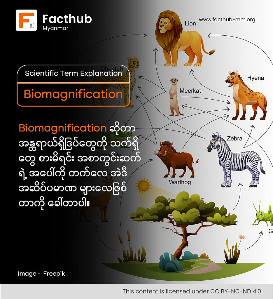 Biomagnification ဆိုတာ အန္တရာယ်ရှိဒြပ်တွေကို သက်ရှိတွေ စားမိရင်း အစာကွင်းဆက်ရဲ့ အပေါ်ကို တက်လေ အဲဒီအဆိပ်ပမာဏ များလေဖြစ်တာကို ခေါ်တာပါ။