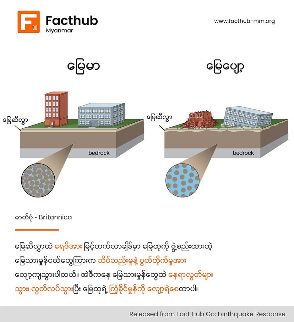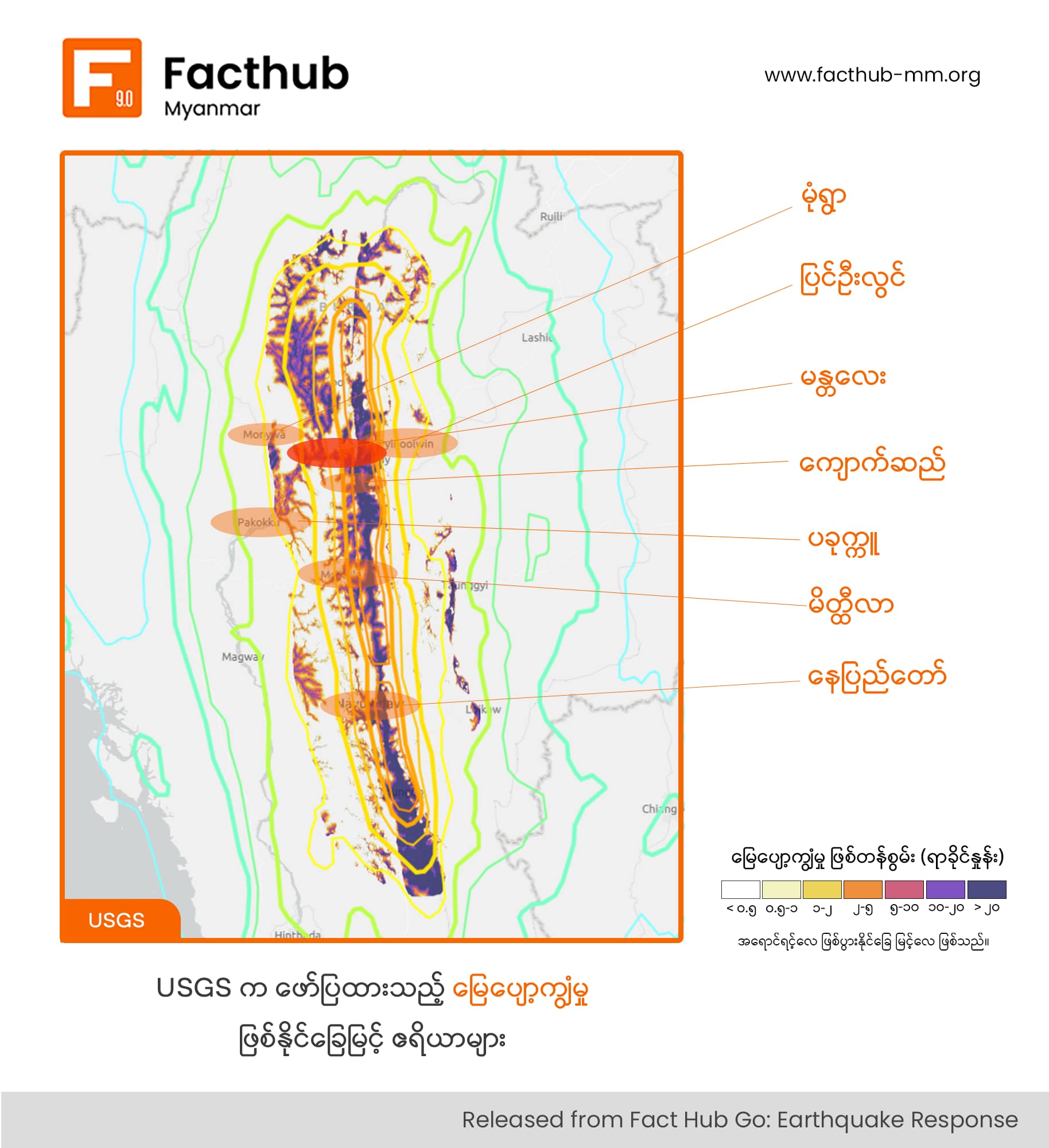 မန္တလေးမြို့အနီးကို ဗဟိုပြုပြီး လှုပ်ခတ်ခဲ့တဲ့ သောကြာနေ့ငလျင်ရဲ့ သက်ရောက်မှုကြောင့် မြေသားပျော့ပြောင်းမှု (Liquefaction) ကို ကြုံတွေ့ရနိုင်တယ်လို့ USGS က သတိပေးထားပါတယ်။